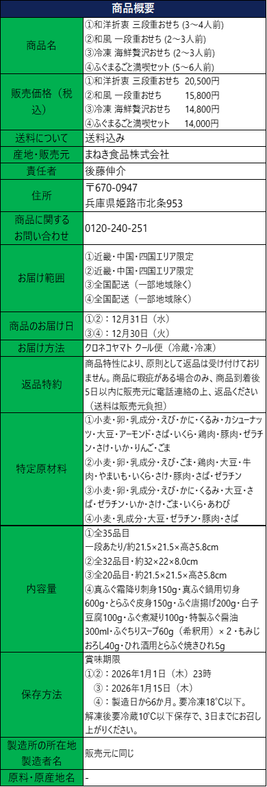 〈12月31日お届け〉 ・和洋折衷 三段重おせち(3~4人前) ・和風 一段重おせち(2~3人前) ※配達地域:近畿・中国・四国限定(一部離島を除く) 『特別な年末、お正月』を演出 年末年始のお祝いに、豪華な「おせち」や「ふぐまるごと満喫セット」はいかがですか? ご家族やご友人と過ごす大切な団欒のひとときを、贅沢な味わいで華やかに彩ります。 この機会にぜひ、格別な美味しさをお楽しみください。
